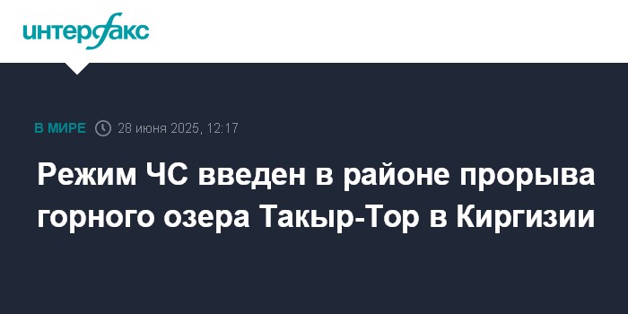 Москва. 28 июня. INTERFAX.RU - Режим чрезвычайной ситуации введен в районе прорыва горного озера Такыр-Тор в Чуйской области Киргизии, сообщает в субботу пресс-служба МЧС страны.