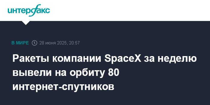 Москва. 28 июня. INTERFAX.RU - Американские ракеты-носители Falcon 9 на текущей неделе вывели на орбиту в общей сложности 80 мини-спутников для пополнения орбитальной группировки глобальной сети интернет-покрытия системы Starlink, следует из данных компании-разработчика SpaceX.