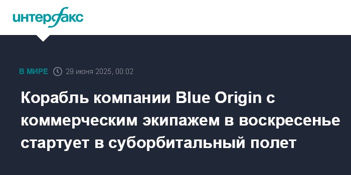 Москва. 28 июня. INTERFAX.RU - Американский многоразовый корабль New Shepard с коммерческим экипажем в составе шести туристов в воскресенье стартует в суборбитальный полет, сообщает компания-разработчик Blue Origin.