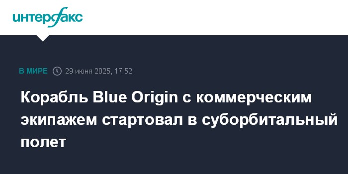 Москва. 29 июня. INTERFAX.RU - Американский многоразовый корабль New Shepard с коммерческим экипажем в составе шести туристов в воскресенье стартовал в суборбитальный полет, сообщила компания-разработчик Blue Origin.