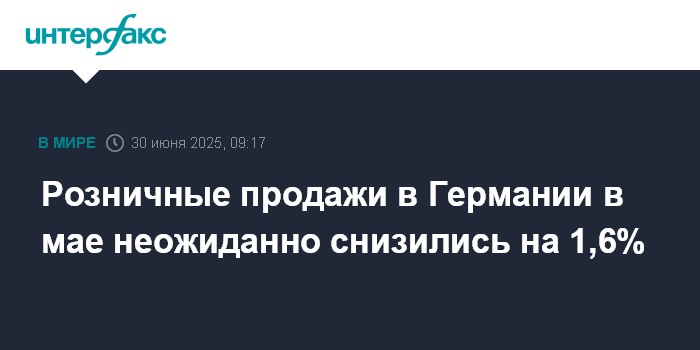Москва. 30 июня. INTERFAX.RU - Розничные продажи в Германии в мае упали на 1,6% относительно предыдущего месяца, сообщило Федеральное статистическое агентство страны (Destatis).