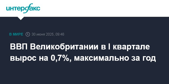 Москва. 30 июня. INTERFAX.RU - Экономика Великобритании в первом квартале 2025 года выросла на 0,7% по сравнению с предыдущими тремя месяцами - максимальными темпами за год. Об этом говорится в отчете Национального статистического управления (ONS), представившего окончательные данные.