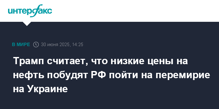 Москва. 30 июня. INTERFAX.RU - Президент США Дональд Трамп заявил, что низкие цены на нефть, вероятно, побудят Россию согласиться на прекращение огня на Украине.