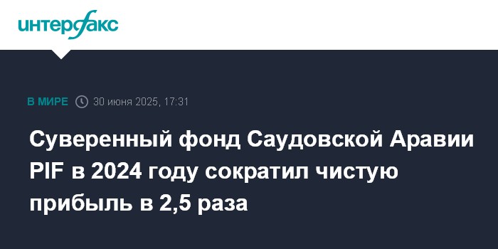 Москва. 30 июня. INTERFAX.RU - Суверенный фонд Саудовской Аравии (Public Investment Fund, PIF) в 2024 году сократил чистую прибыль на 60%, говорится в отчетности фонда.