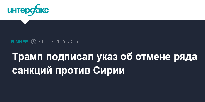 Москва. 30 июня. INTERFAX.RU - Президент США Дональд Трамп подписал указ о смягчении некоторых санкций в отношении Сирии, сообщает в понедельник Белый дом.