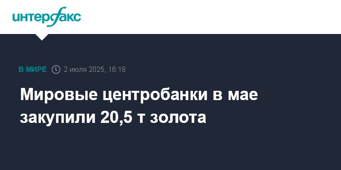 Москва. 2 июля. INTERFAX.RU - Мировые центробанки в мае, по предварительным оценкам World Gold Council (WGC), увеличили объемы золота в своих золотовалютных резервах на 20,5 тонны.