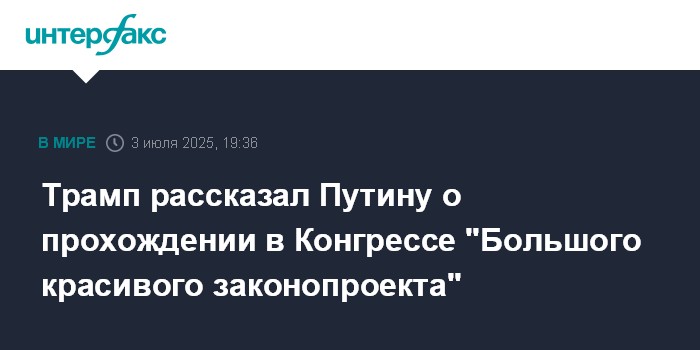 Москва. 3 июля. INTERFAX.RU - Президент США Дональд Трамп в начале телефонного разговора с российским коллегой Владимиром Путиным проинформировал об успешном прохождении в конгрессе флагманского законопроекта его администрации под названием "большой красивый билль", рассказал помощник главы российского государства Юрий Ушаков.