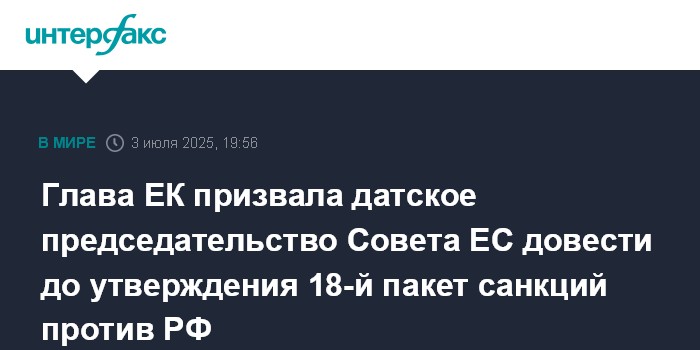 Глава ЕК призвала датское председательство Совета ЕС довести до утверждения 18-й пакет санкций против РФ