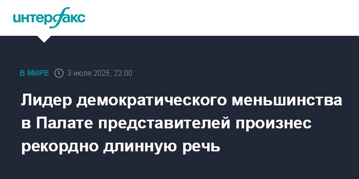 Москва. 3 июля. INTERFAX.RU - Лидер демократического меньшинства в Палате представителей Хаким Джеффрис выступил с почти девятичасовой речью перед голосованием по так называемому большому, красивому законопроекту, побив рекорд республиканца Кевина Маккарти по продолжительности выступления, сообщает в четверг The Hill.