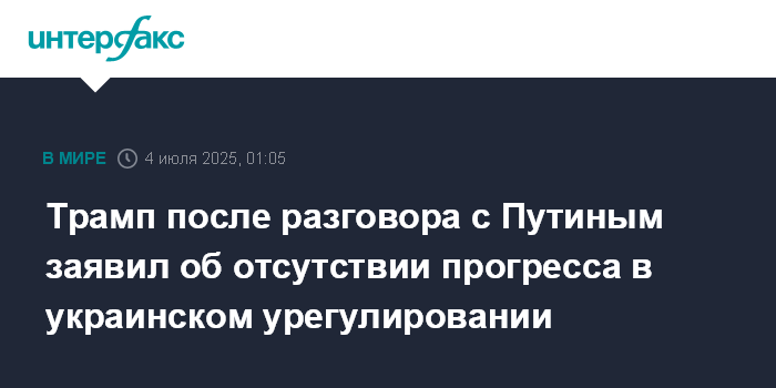 Москва. 4 июля. INTERFAX.RU - Президент США Дональд Трамп заявил, что не достиг прогресса в украинском урегулировании во время телефонного разговора с президентом РФ Владимиром Путиным.