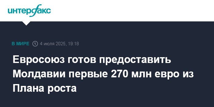 Москва. 4 июля. INTERFAX.RU - Председатель Еврокомиссии Урсула фон дер Ляйен заявила о готовности Евросоюза предоставить Молдавии первые 270 млн евро из так называемого Плана роста. Она заявила об этом на открытии первого саммита Республика Молдова - ЕС.