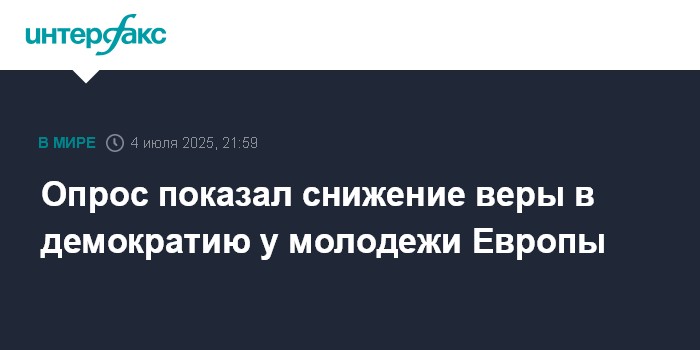 Москва. 4 июля. INTERFAX.RU - В нескольких странах Евросоюза среди молодежи в возрасти от 16 до 26 лет только 57% предпочитают демократию другим политическим режимам, показал опрос YouGov для ежегодного исследования германского фонда TUI "Молодая Европа", пишет Guardian.