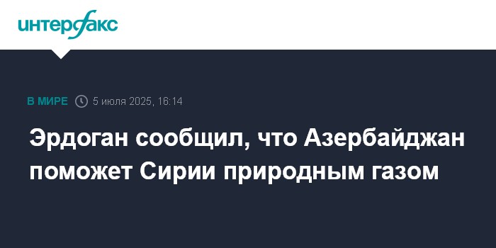 Москва. 5 июля. INTERFAX.RU - Президент Турции Реджеп Тайип Эрдоган сообщил о готовности Азербайджана оказать Сирии поддержку в вопросах обеспечения природным газом.
