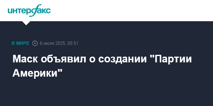 Москва. 6 июля. INTERFAX.RU - Предприниматель-миллиардер Илон Маск объявил, что сформировал в США новую политическую партию - "Партию Америки".