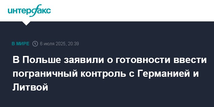 Москва. 6 июля. INTERFAX.RU - Польша полностью готова ввести временный пограничный контроль с Германией и Литвой с полуночи, заявил в воскресенье на брифинге министр внутренних дел и администрации Томаш Семоняк.