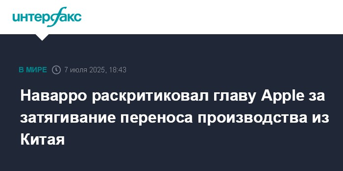 Москва. 7 июля. INTERFAX.RU -Советник президента США Дональда Трампа по вопросам торговли Питер Наварро подверг критике главу Apple Inc. Тима Кука за затягивание перевода производства за пределы Китая.