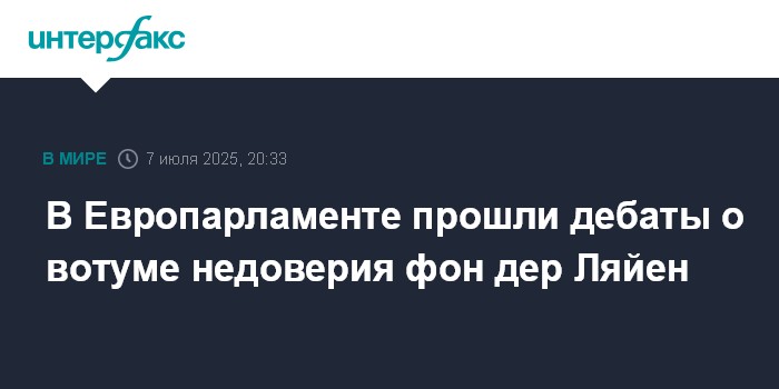 Москва. 7 июля. INTERFAX.RU - На пленарной сессии Европарламента в Страсбурге по инициативе румынского евродепутата Георге Пипереа прошли дебаты по вотуму недоверия председателю Еврокомиссии Урсуле фон дер Ляйен.