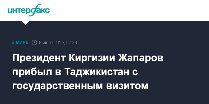 Москва. 8 июля. INTERFAX.RU - Президент Киргизии Садыр Жапаров прибыл с государственным визитом в Таджикистан, сообщает во вторник пресс-служба киргизского лидера.