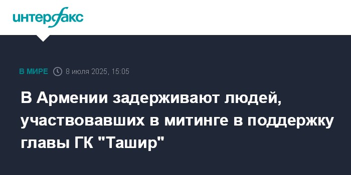 Москва. 8 июля. INTERFAX.RU - Следственный комитет Армении задерживает сторонников арестованного в Ереване главы группы компаний (ГК) "Ташир", российского бизнесмена армянского происхождения Самвела Карапетяна, которые 4 июля участвовали в митинге в его поддержку.