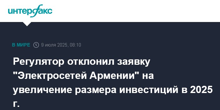 Москва. 9 июля. INTERFAX.RU - Комиссия по регулированию общественных услуг (КРОУ) Армении на заседании во вторник отклонила заявку ЗАО "Электрические сети Армении" (ЭСА) на изменение инвестпрограммы на 2025 год.
