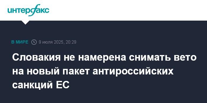 Москва. 9 июля. INTERFAX.RU - Братислава пока не намерена снимать вето на очередной пакет антироссийских санкций ЕС, сообщает Euronews.