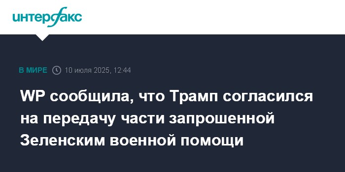 Москва. 10 июля. INTERFAX.RU - Президент США Дональд Трамп одобрил передачу Киеву ряда вооружений из списка, переданного ему президентом Украины Владимиром Зеленским в июне в Гааге, пишет в четверг издание The Washington Post со ссылкой на источник в Белом доме.
