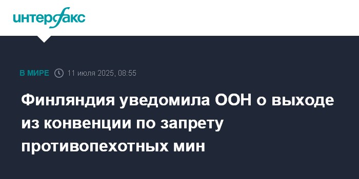 "Финляндия представила документ о выходе из Оттавской конвенции о противопехотных минах 10 июля 2025 года", - говорится в сообщении.
