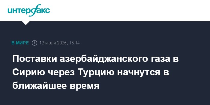 Москва. 12 июля. INTERFAX.RU - Реализация проекта экспорта азербайджанского газа в Сирию через территорию Турции планируется в ближайшее время, говорится в сообщении на официальном сайте президента Азербайджана по итогам встречи в расширенном составе Ильхама Алиева с президентом Сирии на переходный период Ахмедом аш-Шараа.