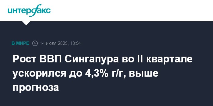 Москва. 14 июля. INTERFAX.RU - Экономика Сингапура во втором квартале 2025 года выросла на 4,3% относительно того же периода прошлого года, по предварительным данным министерства торговли и промышленности страны.