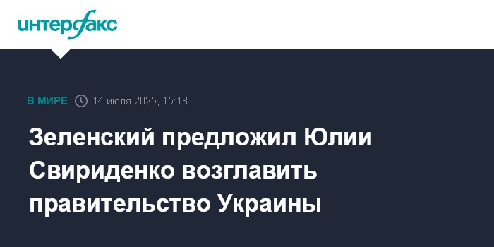 Москва. 14 июля. INTERFAX.RU - Президент Украины Владимир Зеленский встретился в понедельник с первым вице-премьером Юлией Свириденко и предложил ей возглавить правительство, сообщили украинские СМИ.