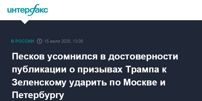 Песков усомнился в достоверности публикации о призывах Трампа к Зеленскому ударить по Москве и Петербургу