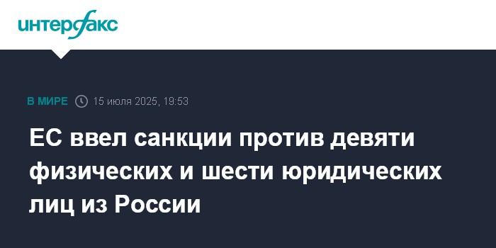 Москва. 15 июля. INTERFAX.RU - Совет ЕС объявил о введении санкций против девяти физических и шести юридических лиц из России, которых он обвинил во вредоносной деятельности в отношении Евросоюза, его государств, международных организаций и третьих стран.