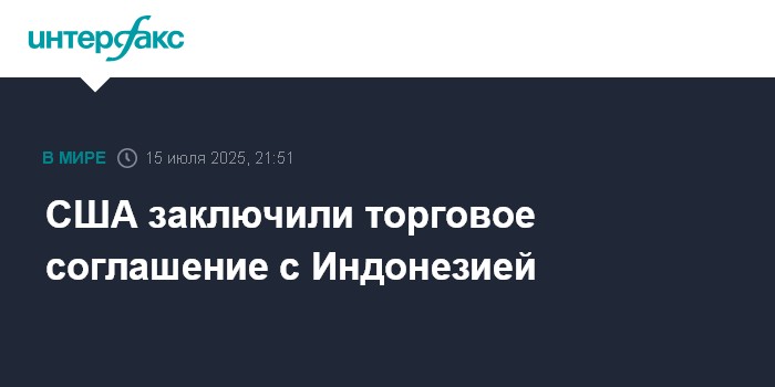 Москва. 15 июля. INTERFAX.RU - В рамках торгового соглашения с США Индонезия будет облагаться пошлинами в 19%, а экспорт американских продуктов в эту азиатскую страну будет беспошлинным, заявил во вторник президент Дональд Трамп.