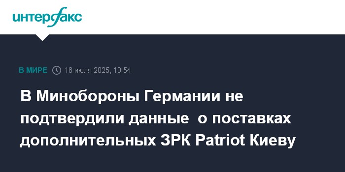 Москва. 16 июля. INTERFAX.RU - В Минобороны Германии, комментируя утверждения президента США Дональда Трампа о начале поставок Берлином дополнительных ЗРК Patriot Украине, заявили, что не имеют сведений о том, что этот процесс действительно начался, сообщает в среду немецкий новостной портал t-online.
