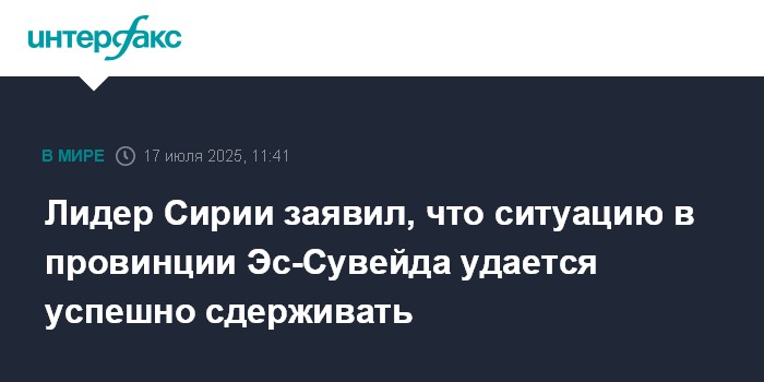 Москва. 17 июля. INTERFAX.RU - Президент Сирии на переходный период Ахмед аш-Шараа считает успешными усилия, предпринимаемые для сдерживания насилия в провинции Эс-Сувейда.