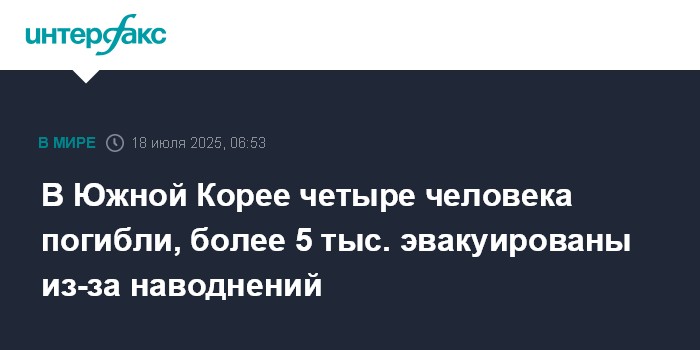 Москва. 18 июля. INTERFAX.RU - Четыре человека погибли в результате сильных дождей, обрушившихся на Южную Корею, сообщает "Ренхап".