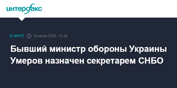 Москва. 18 июля. INTERFAX.RU - Президент Украины Владимир Зеленский назначил Рустема Умерова секретарем Совета национальной безопасности и обороны Украины. Об этом говорится в указе №496/2025 на сайте офиса президента.