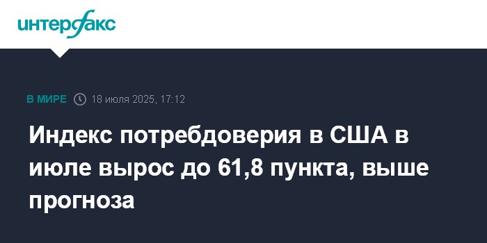 Москва. 18 июля. INTERFAX.RU - Индекс потребительского доверия в США в июле повысился до 61,8 пункта по сравнению с 60,7 пункта месяцем ранее, говорится в предварительном отчете Мичиганского университета, который рассчитывает этот показатель.