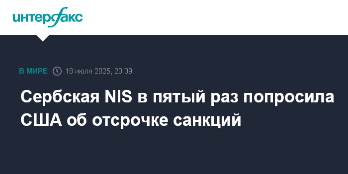Москва. 18 июля. INTERFAX.RU - Сербская NIS в пятый раз попросила Минфин США о предоставлении отсрочки от санкций - теперь после 29 июля, говорится в сообщении компании.