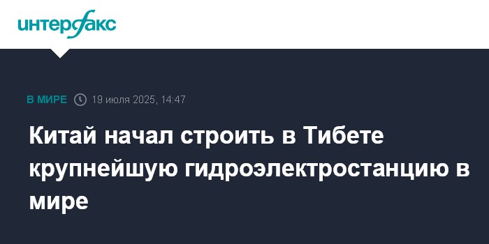 Москва. 19 июля. INTERFAX.RU - Власти КНР в субботу приступили к строительству гигантской гидроэлектростанции на Тибетском нагорье на реке Ярлунг Цангпо, сообщают западные СМИ.
