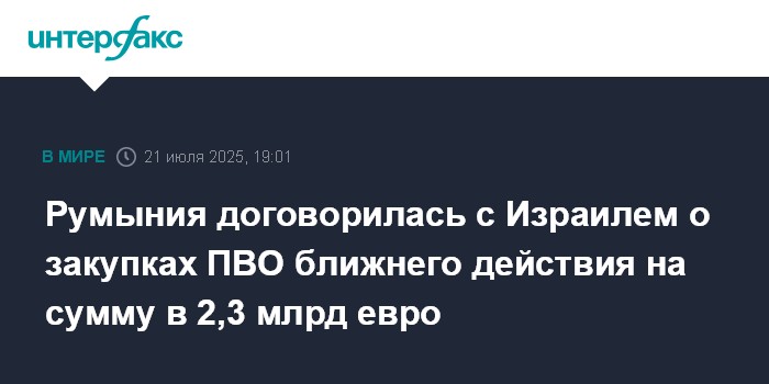 Москва. 21 июля. INTERFAX.RU - Румыния подписала рамочное соглашение с израильской компанией Rafael Advanced Defense Systems о покупке систем ПВО ближнего радиуса действия на сумму в 2,3 млрд евро, передают в понедельник западные СМИ со ссылкой на румынское Минобороны.