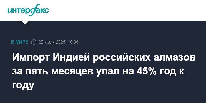 Москва. 22 июля. INTERFAX.RU - Прямой импорт алмазов из России в Индию в январе-мае 2025 года упал на 45%, составив $262,3 млн, сообщило министерство торговли и промышленности Индии.