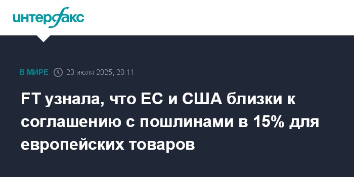 FT узнала, что ЕС и США близки к соглашению с пошлинами в 15% для европейских товаров