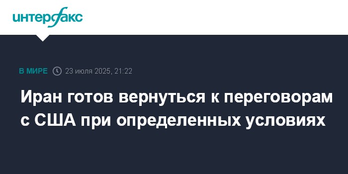 Москва. 23 июля. INTERFAX.RU - Иран готов вернуться за стол переговоров с США "чем скорее, тем лучше", но сначала должен получить гарантии, что новый раунд не будет прикрытием для дальнейших военных действий, сообщает портал Axios в среду.