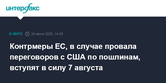 Москва. 24 июля. INTERFAX.RU - Если Евросоюз и США не придут к соглашению по пошлинам до 1 августа, европейские контрмеры вступят в силу 7 августа, сообщил официальный представитель Еврокомиссии (ЕК) Олоф Жилл.