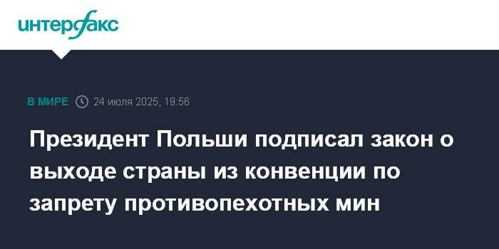 "Президент Республики Польша Анджей Дуда подписал закон от 25 июня 2025 года о денонсации конвенции о запрещении применения, накопления запасов, производства и передачи противопехотных мин и об их уничтожении, принятой в Осло 18 сентября 1997 года", - говорится в сообщении.