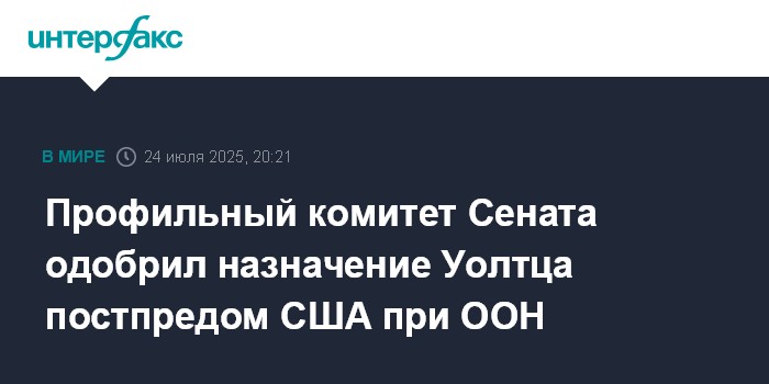 Москва. 24 июля. INTERFAX.RU - Комитет Сената по международным отношениям поддержал назначение бывшего советника президента по нацбезопасности Майка Уолтца на пост постпреда США при ООН, передает Axios.