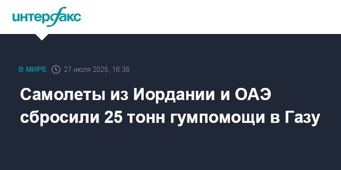 Москва. 27 июля. INTERFAX.RU - Грузовые самолеты из Иордании и ОАЭ в воскресенье сбросили 25 тонн гуманитарной помощи в сектор Газа, сообщают ближневосточные СМИ.