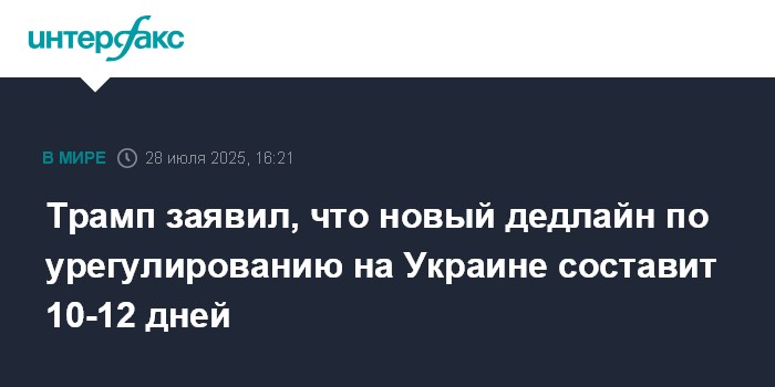 Москва. 28 июля. INTERFAX.RU - Новый дедлайн по достижению соглашения между РФ и Украиной не будет превышать 10-12 дней вместо ранее намеченных 50 дней, заявил президент США Дональд Трамп.