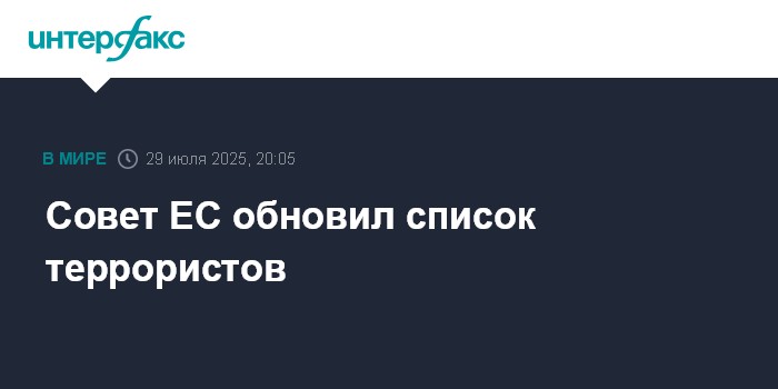 Москва. 29 июля. INTERFAX.RU - Совет ЕС обновил список лиц, групп и организаций, попадающих под ограничительные меры в целях борьбы с терроризмом.